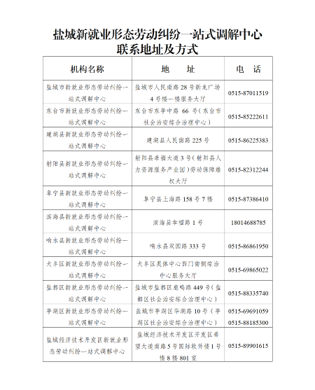 为进一步稳妥处理依托互联网平台就业的网约配送员、网约车驾驶员、货车司机、互联网营销师、家政服务人员等新就业形态劳动者与互联网平台企业及合作用工企业之间发生的劳动保障权益纠纷,保障劳动者合法权益,促进新就业形态健康发展,维护社会和谐稳定,盐城市人力资源和社会保障局在全市范围内建立新就业形态劳动纠纷一站式调解中心。