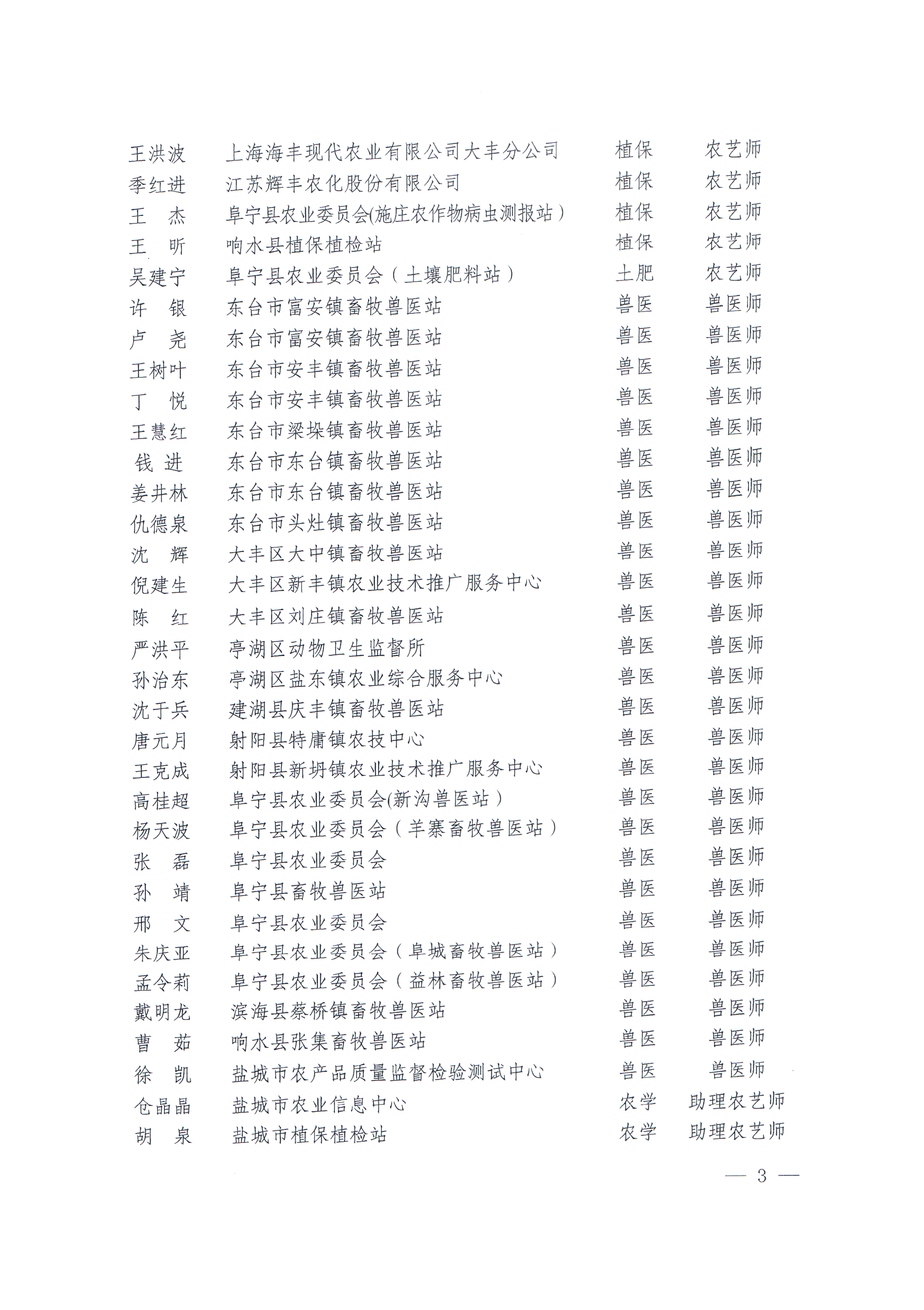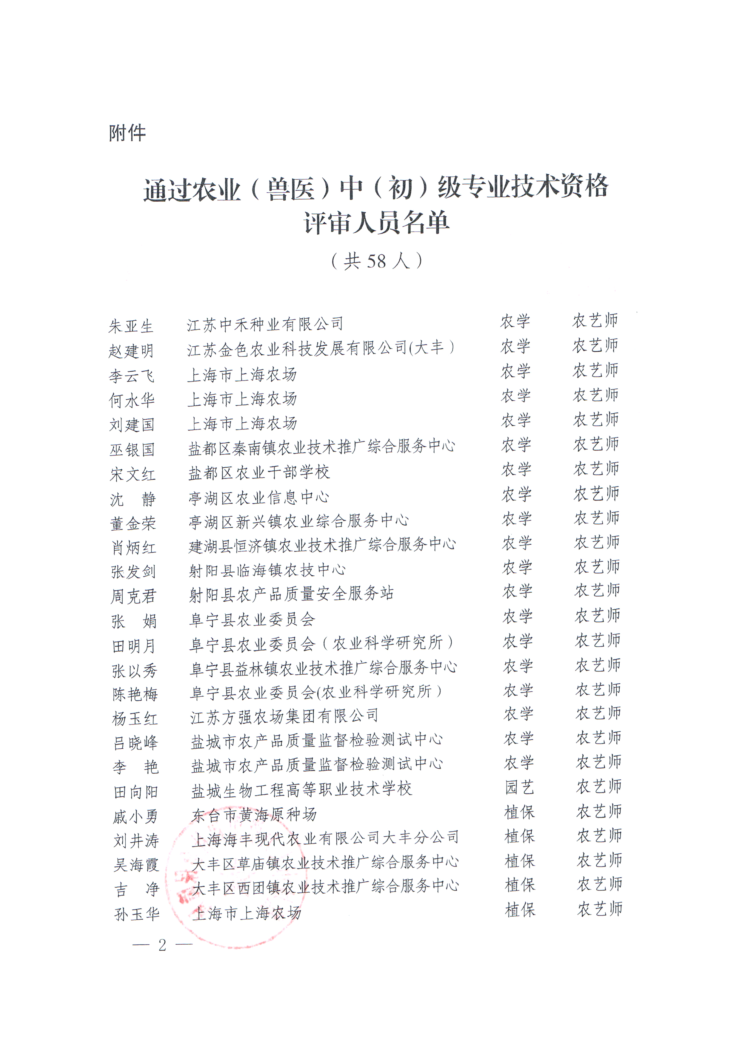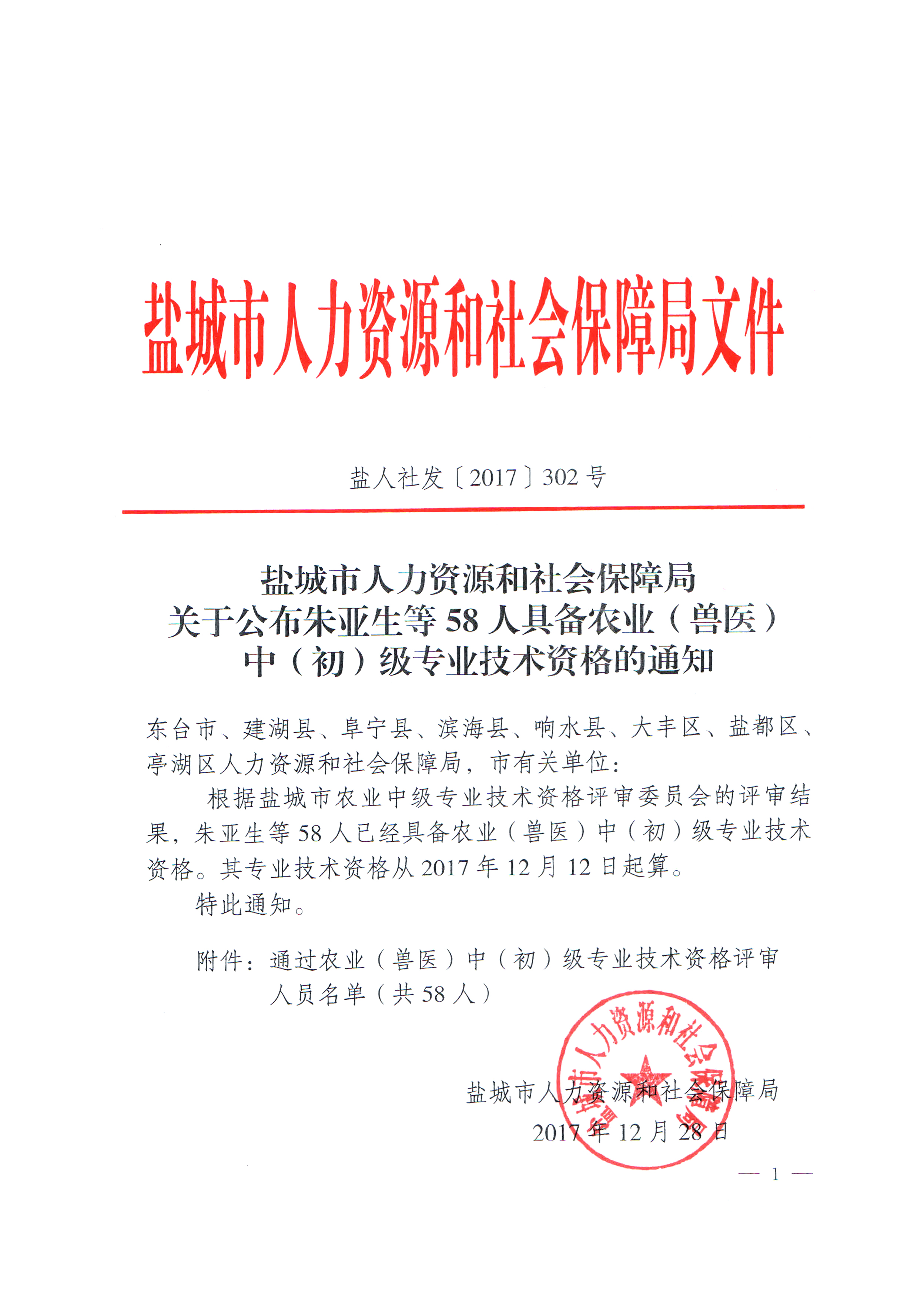 关于公布朱亚生等58人具备农业(兽医)中(初)级专业技术资格的通知